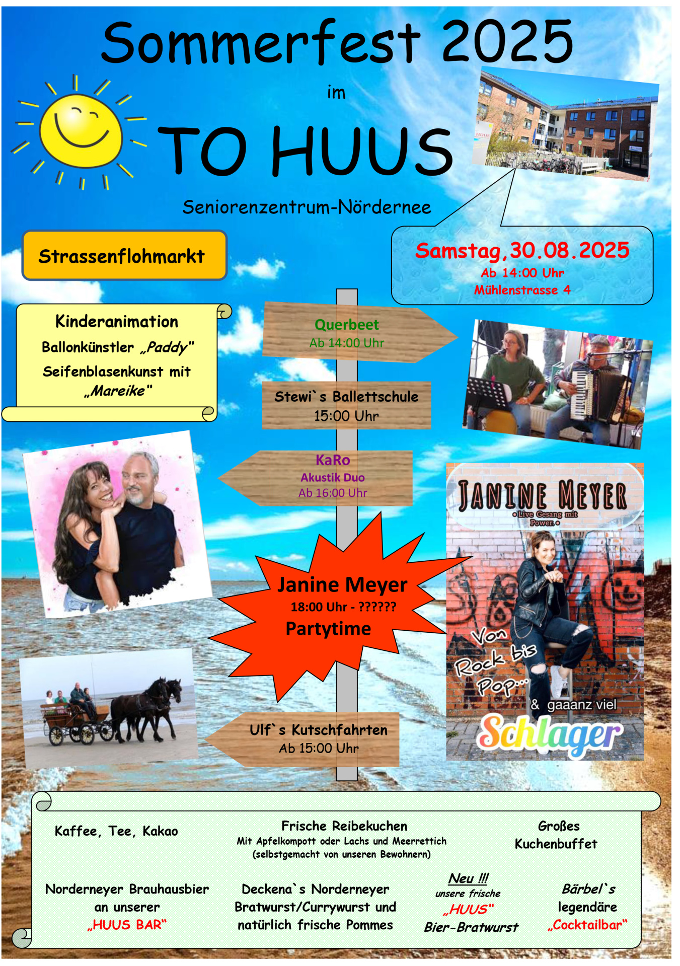 Das Team des Seniorenzentrums To Huus lädt zum Sommerfest. Es gibt Livemusik von Querbeet und Janine Meyer. Für die Kinder gibt es eine Hüpfburg und Kinderschminken sowie einen Ballonkünstler.